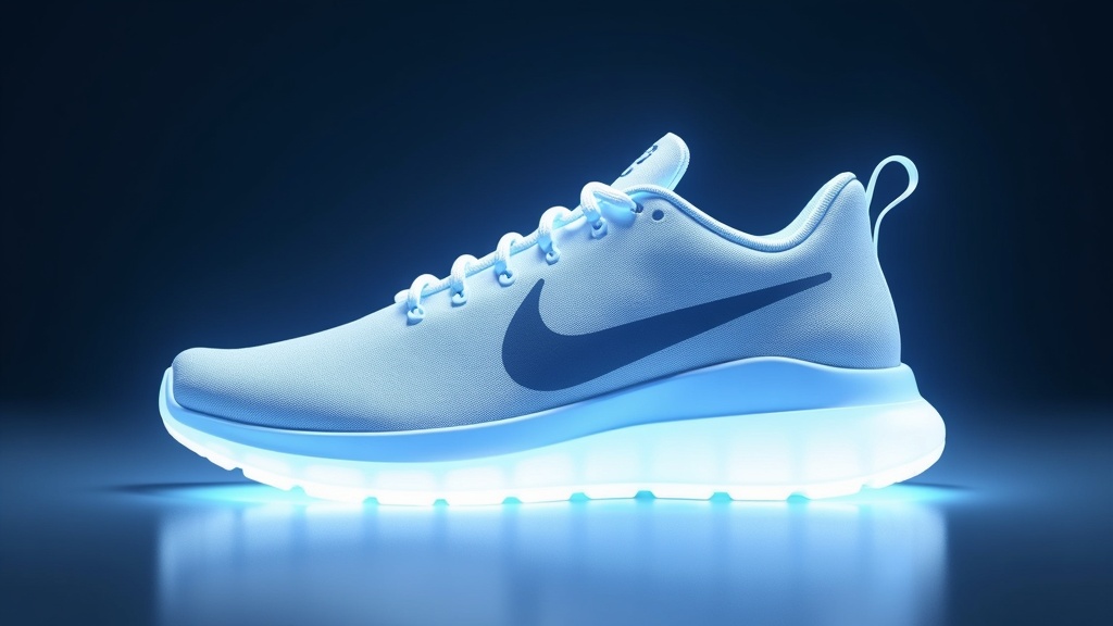 Translucent innovation, avant-garde product design, 3D visualization, Octane-rendered, serene yet high contrast, weightless elegance, luminous Nike sneakers, sleek and futuristic, harmonious balance of form and function, ethereal ambiance, radiant and modern appeal.