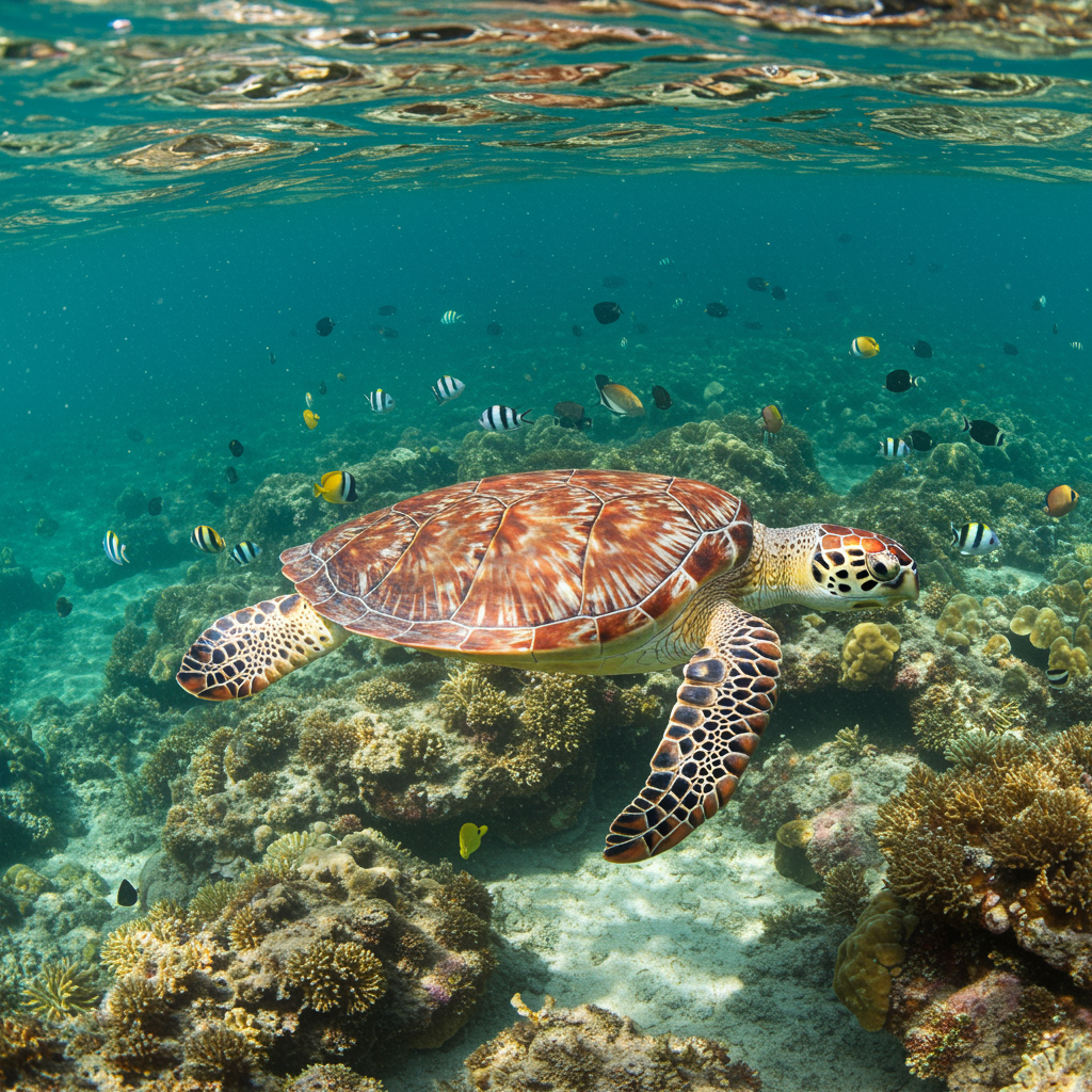 A gentle turtle meanders through a vibrant underwater garden, its patterned shell glinting softly in the dappled sunlight that filters down through the clear water, surrounded by colorful fish and swaying seaweed.
