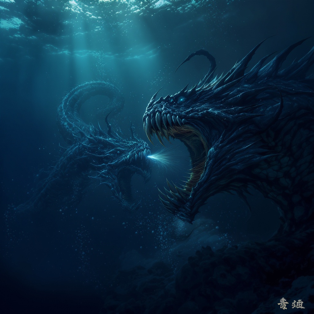 View this AI-generated image featuring two colossal sea creatures locked in an epic battle displaying immense power rage and fury deep beneath the ocean s surface surrounded by a shadowy underwater abyss the scene captures a dramatic wide shot with an aerial perspective highlighting the dark fantasy