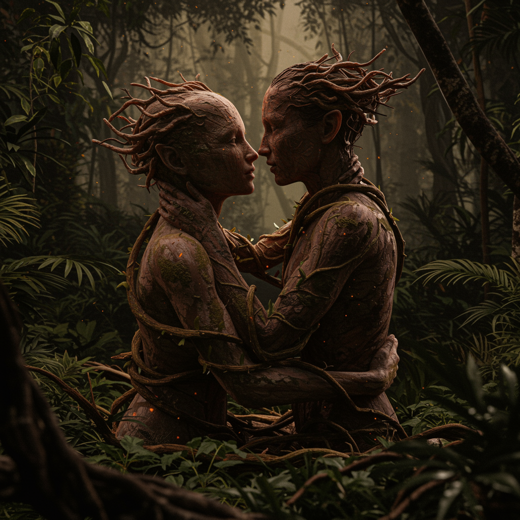 View this AI-generated image featuring two figures embraced in a jungle ethereal bodies entwined with vines rendered with a focus on physical realism their facial features detailed and expressive infused with earthcore textures the scene is dark and intricate with hints of firecore elements adding a
