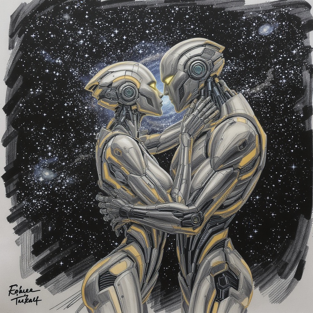 View this AI-generated image featuring two futuristic cyborgs embracing in a passionate kiss at the precipice of the cosmos surrounded by a swirling tapestry of stars their forms aligned with the harmony of the golden ratio rendered in a dynamic concept sketch style with subtle creative embellishmen