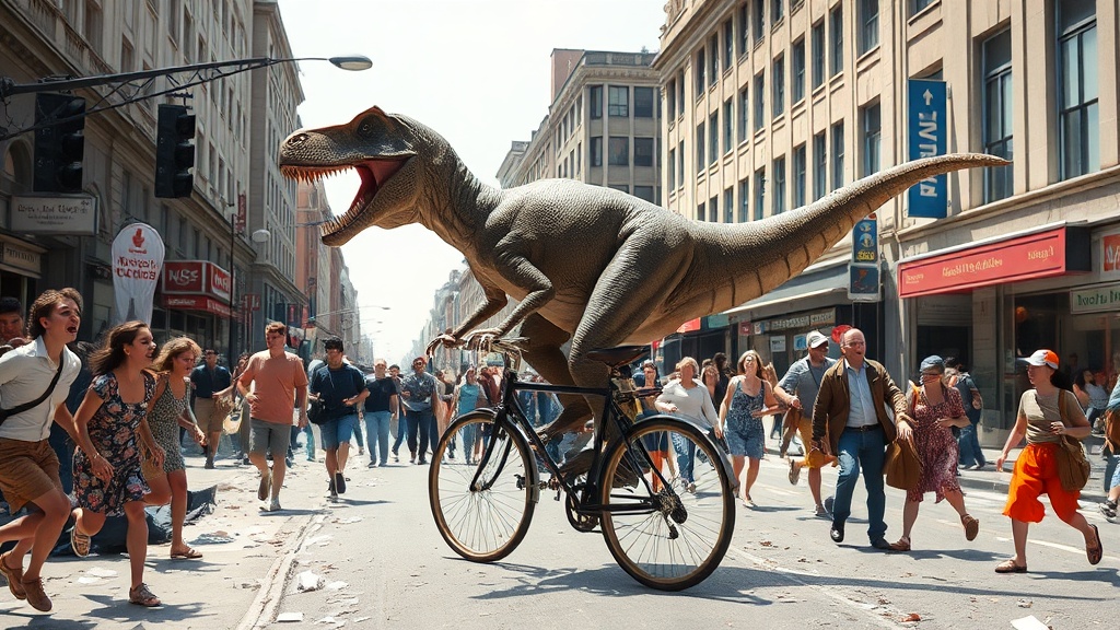 A lifelike Tyrannosaurus rex expertly navigating a city street on a bicycle, its massive tail balancing it as it pedals furiously. Detailed pedestrians in a vibrant array of clothing and expressions dart away in sheer panic, faces frozen in exaggerated screams. The scene captures the chaos and energy of an unexpected prehistoric invasion, with cluttered streets, scattered papers, and upturned market stalls adding to the pandemonium, all under a bright, sunny sky.