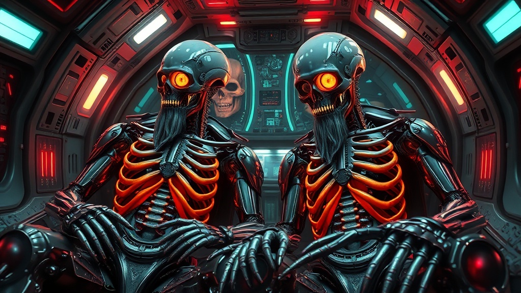 View this AI-generated image featuring ultra detailed cyborg in a spaceship with anthropomorphic cybernetic skeleton elements on metal armor featuring neon light reflections and intricate design the scene is set with dramatic lighting to highlight the hyperrealism and photorealistic features the cha