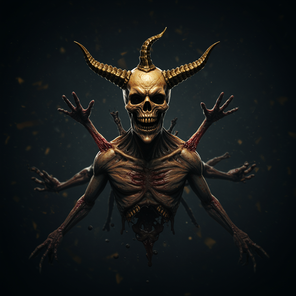 Ultra wide angle dark epic backdrop, stunning lifelike elements with a golden motif, skull joker demon with cinematic flair, incredibly detailed and hyperdetailed features, intentionally flawed anatomy with extra or missing limbs, floating disconnected parts, grotesque mutations and distortions, ugly and unsettling with hints of blurriness and amputation.