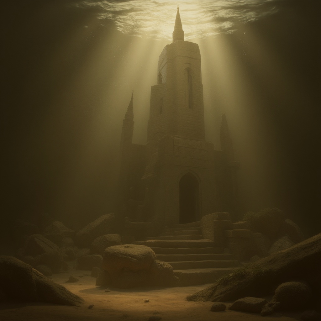 View this AI-generated image featuring underwater atlantis shimmering caustics and snell s window effects ethereal god rays filtering through relics of the past scattered still image dramatic cinematographic lighting expert color grading cinematic sepia tones masterpiece quality intricately detailed
