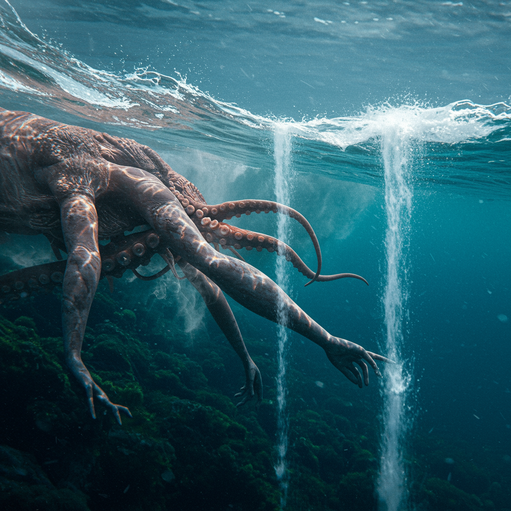 underwater, close-up, zoom in, surreal elements, waves, water cascading, tentacles, smoke, high-resolution, detailed textures, cinematic perspective, intricate details, side view, abstract anatomy, distorted proportions, mixed media, digital art, sketch, painting, floating limbs, unusual forms, artistic mutation, unconventional beauty, blurred focus, glossy effects, vibrant colors, experimental design, multi-limbed figures, dynamic composition, ethereal atmosphere, harmonious chaos, enigmatic forms.