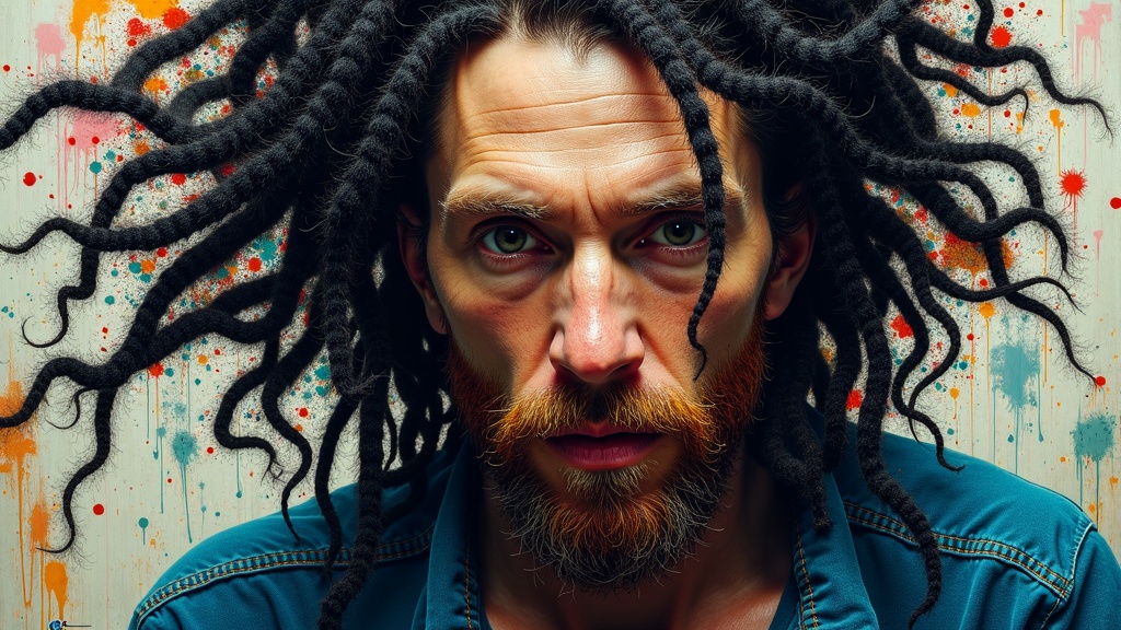 Van Gogh reimagined with flowing black dreadlocks, his intense gaze capturing the passion and turmoil within, vibrant colors swirling around him in a whirlwind of creativity and depth.