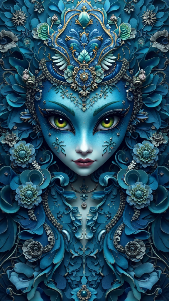 View this AI-generated image featuring venetian carnival scene in a fantastical composition vibrant and captivating with symmetrically arranged elements featuring navy and aquamarine hues intricate gothic details and distinctive facial features particularly prominent noses set the tone a whimsical s