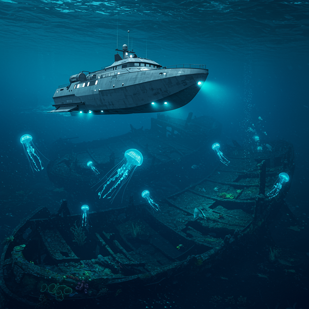 An underwater vessel navigating through the mysterious depths of the sea, surrounded by bioluminescent creatures and ancient shipwrecks, as sonar pings echo in the vast, silent blue.