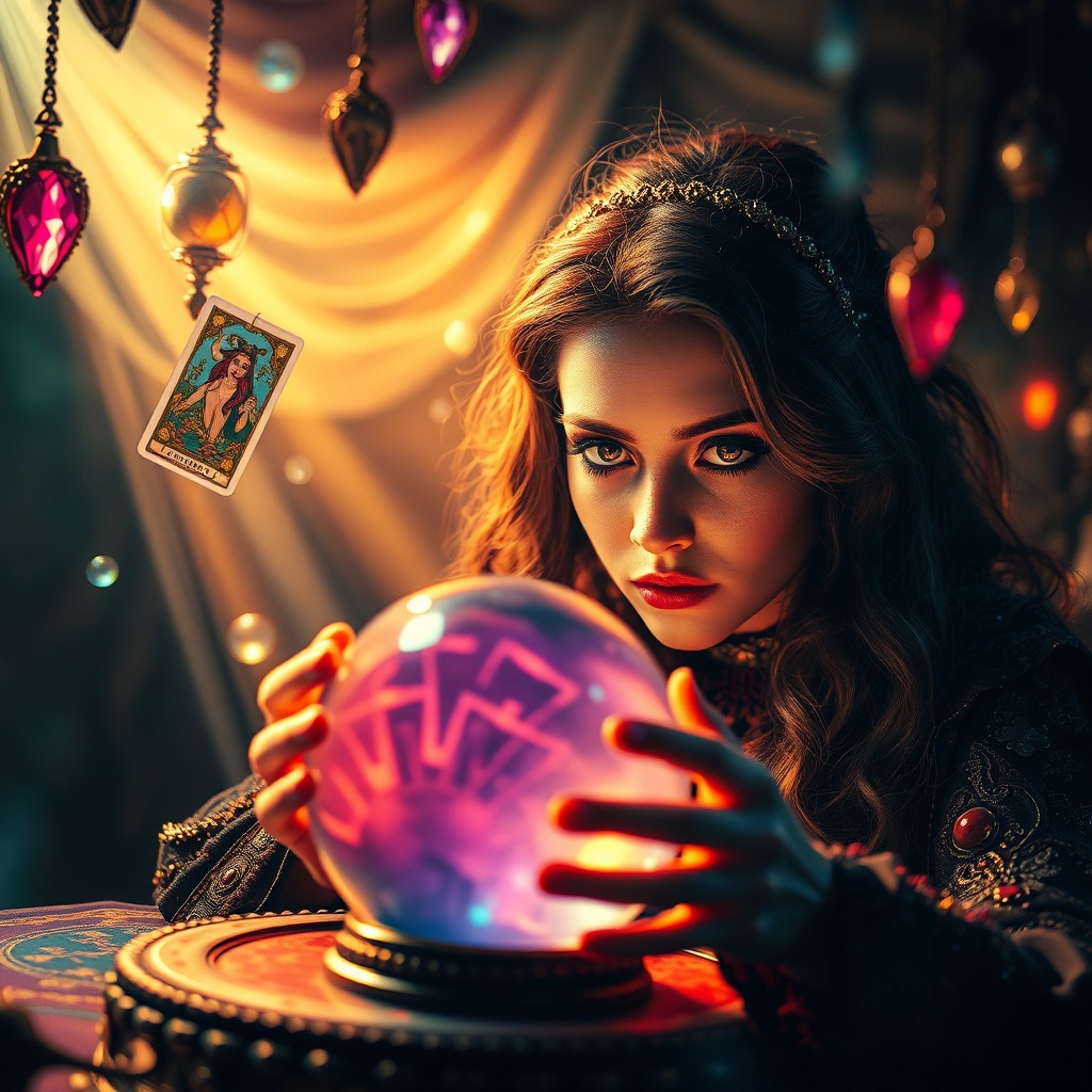 Vibrant and enchanting scene featuring a mesmerizing fortune teller surrounded by an ethereal aura and streams of mystical light. She peers into a beautifully detailed crystal ball, her surroundings adorned with intricate jewels and colorful tarot cards suspended in mid-air. The image captures ultra-detailed, intricate features with cinematic lighting, sharp focus, and a dynamic depth of field reminiscent of 70mm film. The atmosphere is rich and arcane, exuding a sense of mystery and magic. The setting is rendered in stunning 8k UHD with HDR quality, ensuring every detail is vivid and lifelike. The fortune teller's expression is captivating, and her presence commands attention, evoking a sense of wonder and fascination. The composition is flawless, free of distractions like low resolution, artifacts, or unwanted elements, providing an immersive and visually stunning experience.