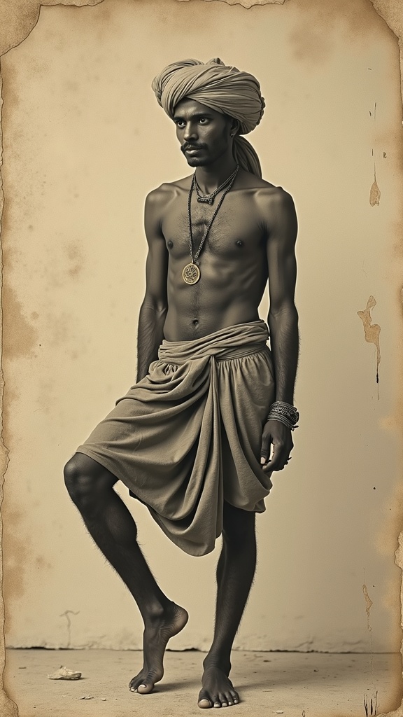 View this AI-generated image featuring vintage photograph of an indian man in a turban legs elevated inspired by disfigured forms and contemporary middle eastern and north african art from 1860 1969 evoking a brooding atmosphere the composition is sparse and minimalist resembling a tapestry of photo
