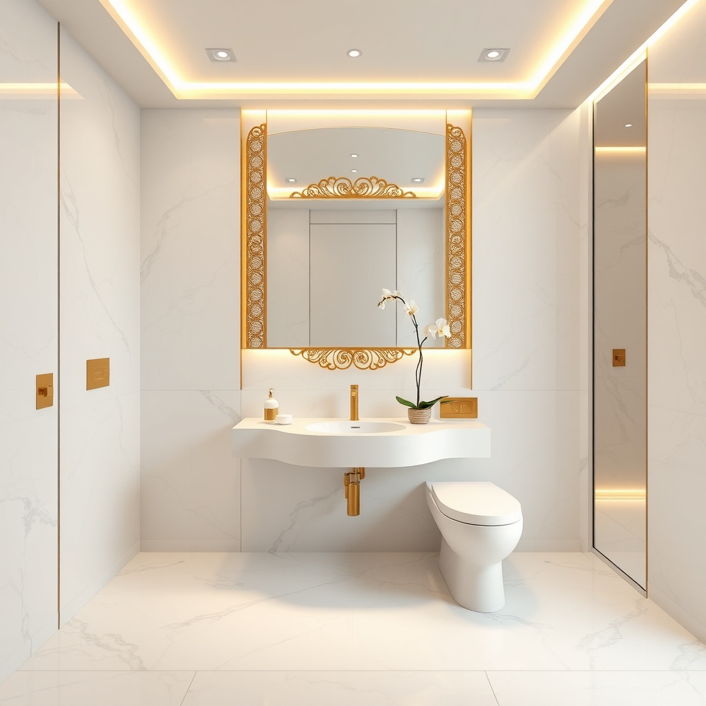 Visualize a modern luxury bathroom interior from a front-view perspective, showcasing an elegant white marble sink paired with a matte gold faucet. The space features a sleek wall-mounted toilet in luxurious white ceramic. A large mirror with an intricate gold filigree frame reflects the room's opulent decor. The floor and walls are adorned with expansive white marble tiles featuring delicate grey veining, enhancing the lavish aesthetic. Integrated soft LED lighting in the ceiling and behind the mirror casts a warm, inviting glow throughout the room, creating a serene and opulent atmosphere. Polished surfaces and elegant lines define the luxury bathroom design, with a subtle infusion of natural daylight mingling with warm artificial light, highlighting the exquisite details. To add a unique touch, include a small, elegant white orchid in a simple gold-edged vase on the countertop, bringing a hint of nature into the sumptuous space.