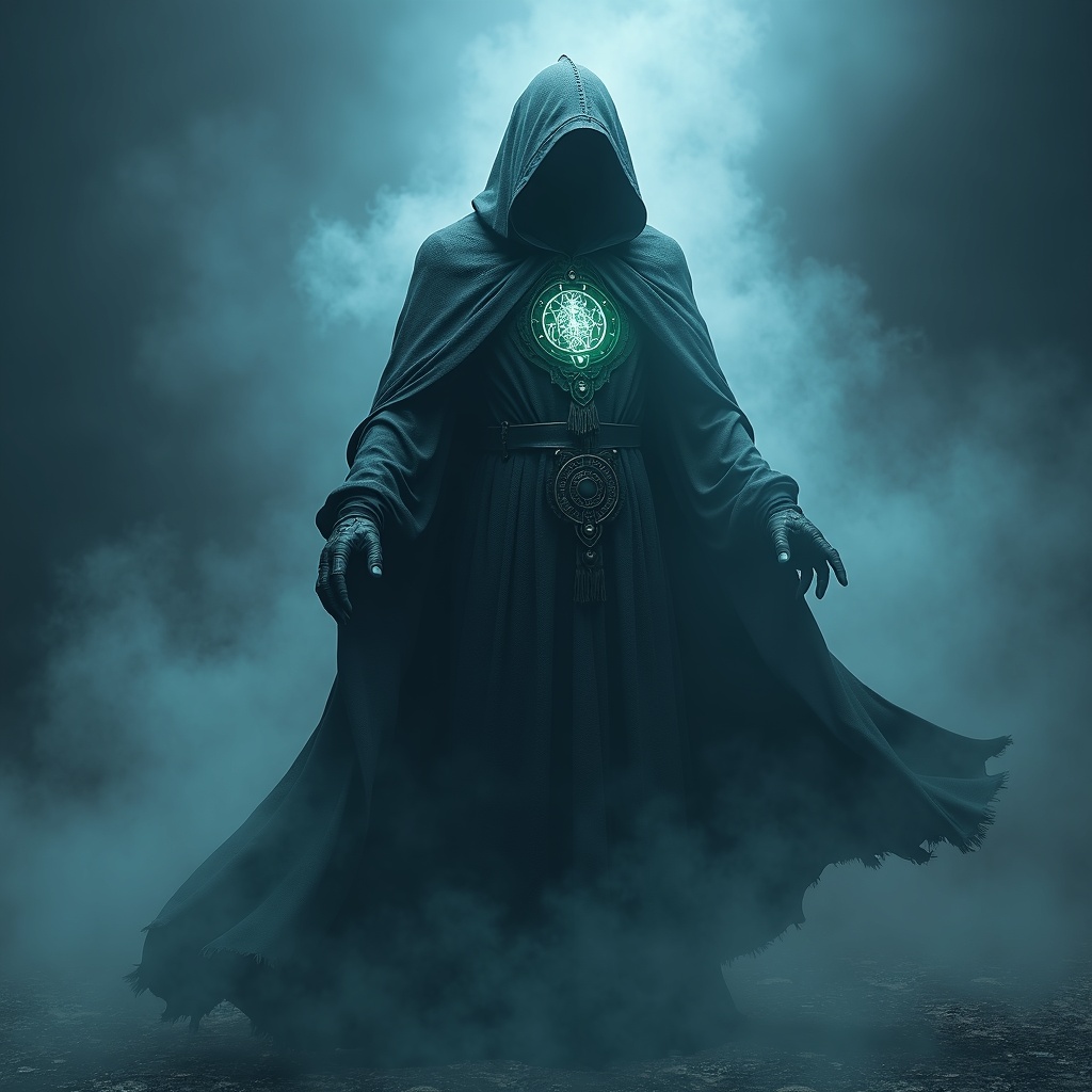 Void sorcerer character design enveloped in ethereal mist, displaying hyper-realistic details rendered in Octane and enhanced by Unreal Engine, featuring intricate patterns and textures, glowing arcane symbols etched into a flowing cloak, with dramatic volumetric lighting casting dynamic shadows that dance within the void.