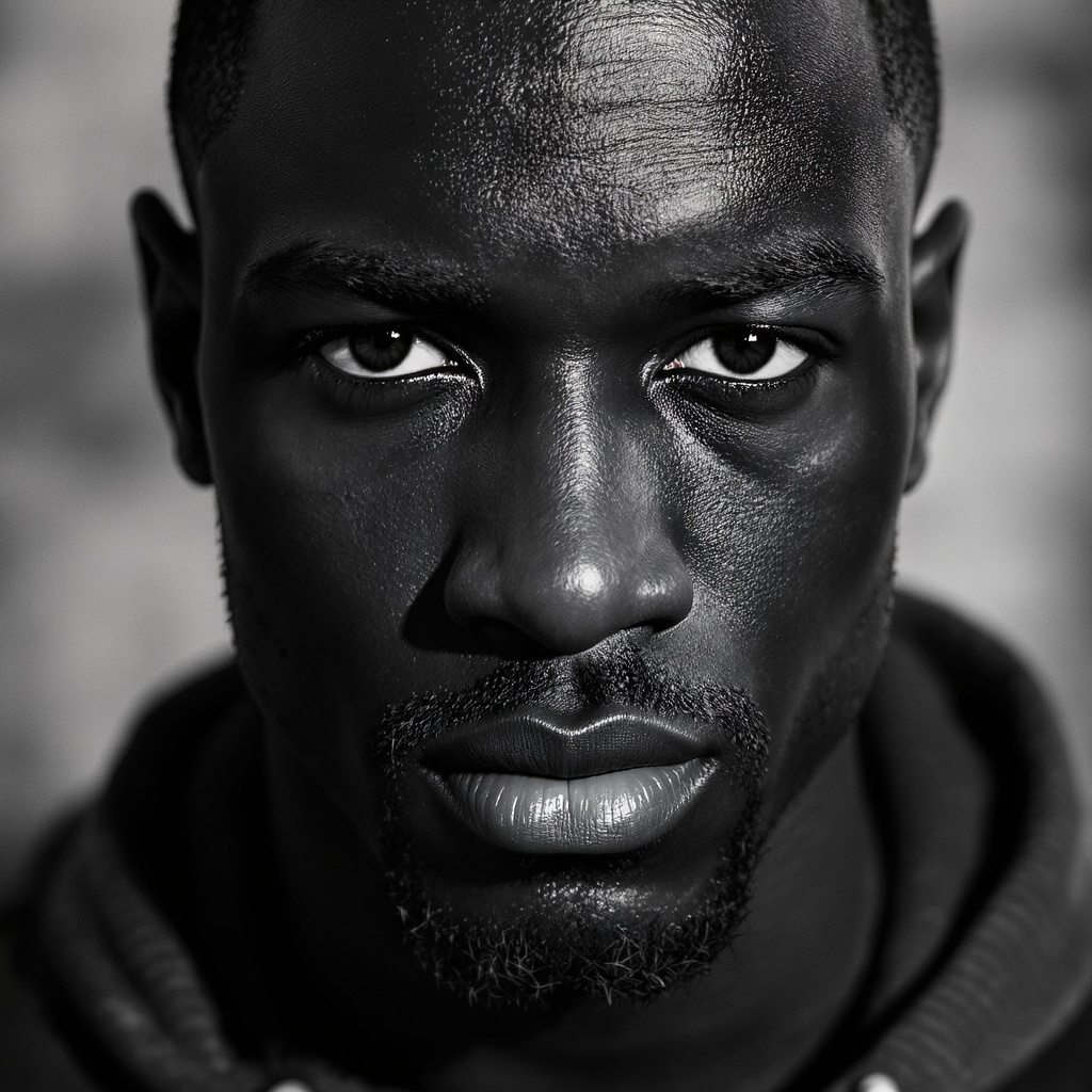 View this AI-generated image featuring wallpaper high detail photograph of a black man gazing directly at the camera intense close up black and white style classic leica 50mm lens shot with aperture f1 4. Created using advanced AI technology, this image showcases creative visuals, AI artwork. Perfec
