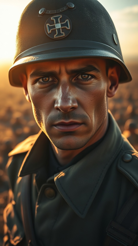 A World War II German soldier standing solemnly amidst a sprawling battlefield backdrop, his eyes an intricate tapestry of emotion—perfectly human, each pupil a deep well of experience and resolve. Bathed in the soft natural light reminiscent of Joaquin Sorolla's brushwork, golden sunshine grazes his weary yet determined face, casting dynamic cinematic shadows that breathe life into the scene. Captured with the clarity of an 85mm lens, the moment is rich in detail; lumen reflections dance subtly across his uniform. The environment around him is both breathtaking and haunting, a masterpiece of hyperrealism achieved through advanced CGI and octane render, complete with raytraced lighting that enhances depth and authenticity.