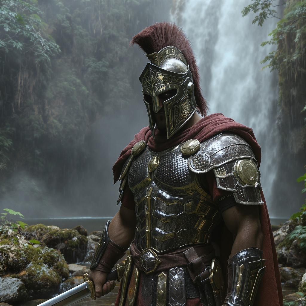 View this AI-generated image featuring a roman warrior clad in intricately detailed spartan armor stands confidently in the lush amazon river gorge the mist from an impressive waterfall casting a shimmering veil around him the scene is captured in breathtaking 8k ultra realistic detail with photorea
