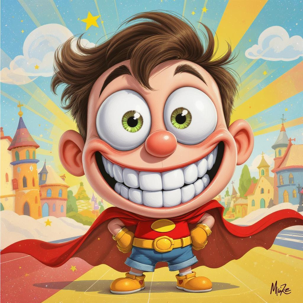 View this AI-generated image featuring whimsical cartoon illustration of a children s comic book hero with comically oversized eyes and a gigantic grin exaggerated features in a playful manner bright and vibrant colors fantastical proportions art style infused with humor and imagination ar 1 2 styli