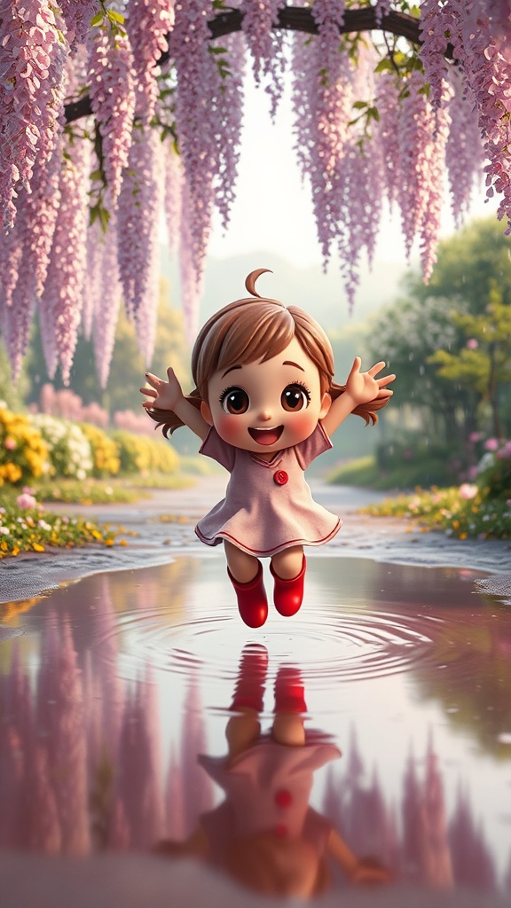 Whimsical character design 3D octane render, wide shot, chibi extraordinarily adorable young girl doll leaping joyfully in a vibrant puddle, enchanting landscape, beneath a cascading wisteria tree, wearing bright red rain boots, oversized expressive eyes, award-winning quality, hypermaximalist style, octane render, soft volumetric lighting, intricate details, cinematic atmosphere, magical ambiance with sparkling droplets and shimmering reflections.