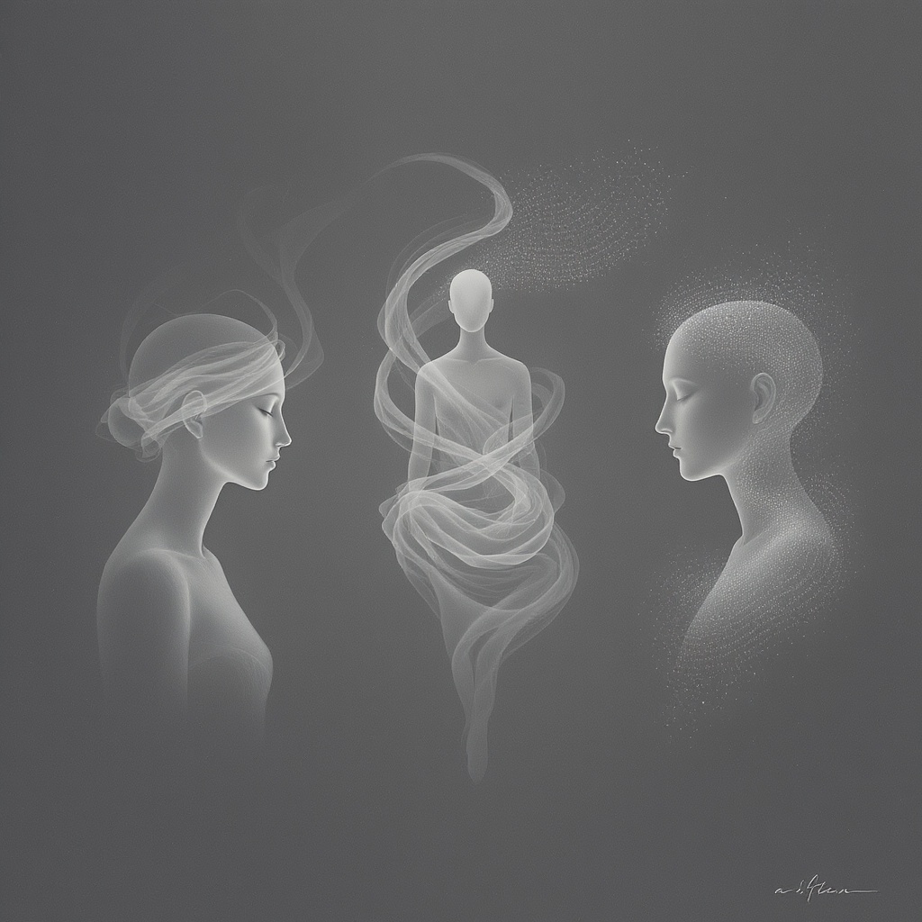 View this AI-generated image featuring whispers of silence and shadows playfully dance as three figures embody the art of seeing hearing and speaking no evil. Created using advanced AI technology, this image showcases creative visuals, AI artwork. Perfect for creative projects, digital art, inspirat