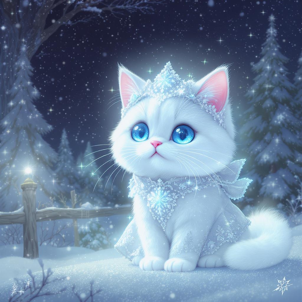 A whimsical white cat, exuding an adorable and kawaii charm, adorned with a magical aura and an ethereal presence, is dressed in exquisite winter fashion. Its attire is embellished with intricate silver filigree details, creating an enchanting contrast that complements its snowy surroundings. The scenic environment is blanketed with snowflakes gently falling from the sky, casting a dreamy and surreal atmosphere that glistens under a starlit night. This enchanting scene, reminiscent of the creative vision of Yoshitomo Nara, Ray Caesar, and the storytelling essence of Studio Ghibli, captures the imagination with its blend of wonder and artistry.