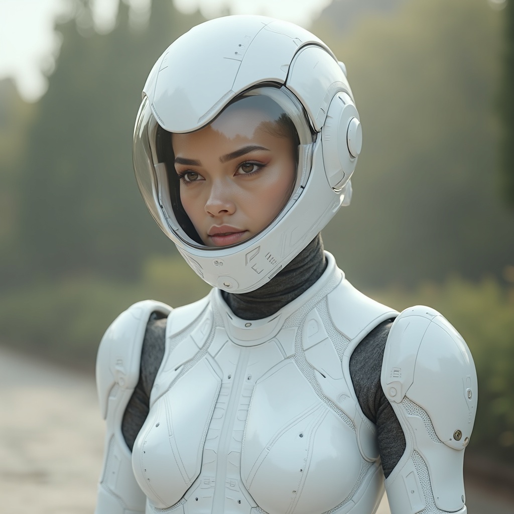 White futuristic female armor with intricate patterns and a high-tech cybernetic helmet, fully encompassing the body with insulated plating resembling a sleek spacesuit. The armor reflects a minimalist sci-fi movie style, designed for a character with a bald head, showcasing meticulous detailing that highlights its advanced technology. Captured in an outdoor setting, the scene uses natural light to enhance the photorealism, presenting a cinematic and highly detailed rendering. The environment, rendered with ray tracing, adds depth and dimension, ensuring the highest quality and visual impact from a third-person perspective.
