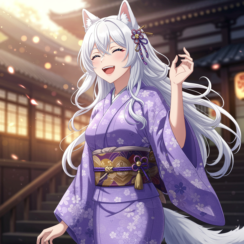View this AI-generated image featuring a joyful and stunning white haired anime wolf girl adorned in a lavender kimono her wavy tresses cascading elegantly she exudes beauty with an exquisitely detailed face set against soft lighting that creates a dreamy aura enhanced by subtle blur and warm flares
