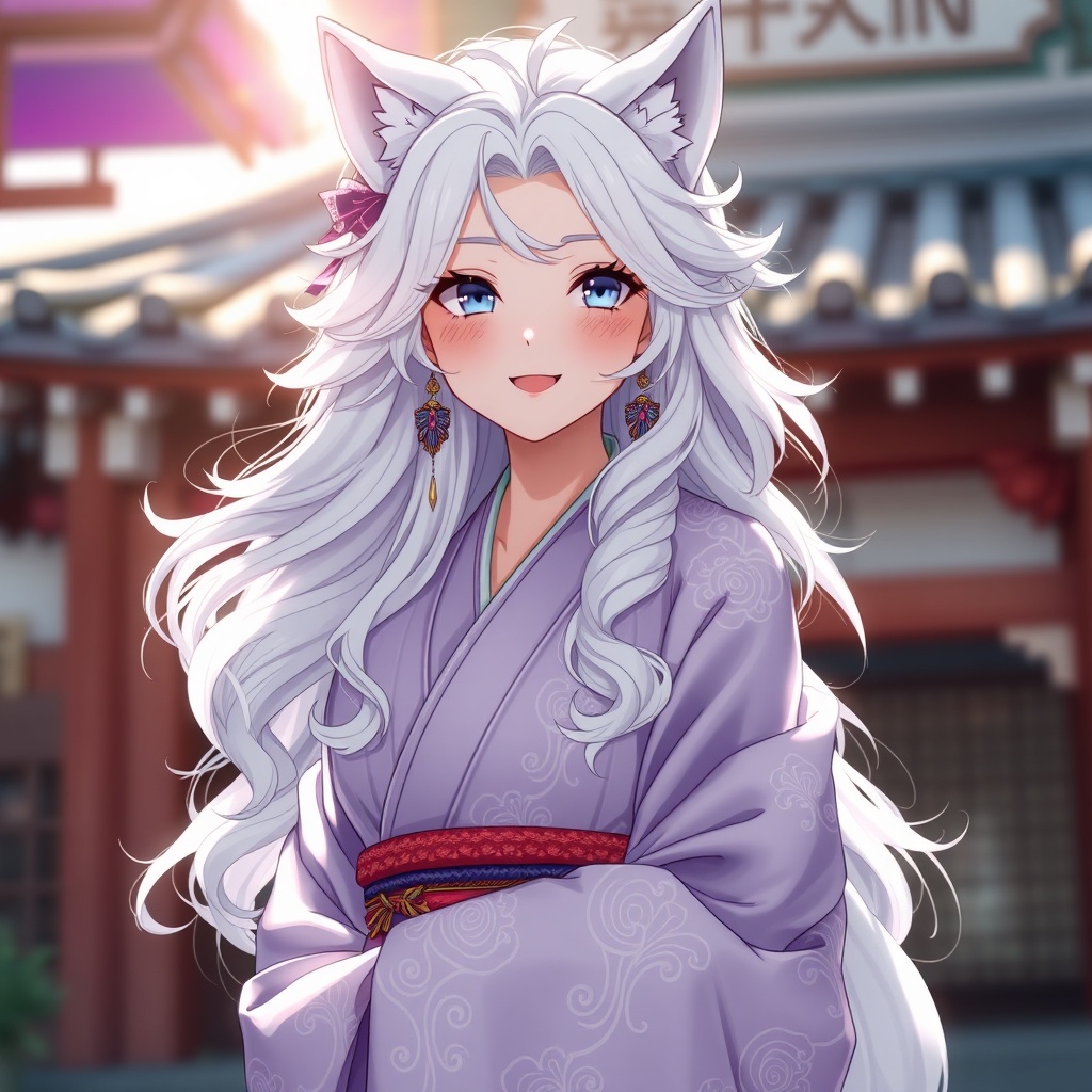 View this AI-generated image featuring a joyful and stunning white haired anime wolf girl adorned in a flowing lavender kimono stands gracefully her wavy hair cascading elegantly her exquisite face is softly illuminated creating an ethereal glow with a gentle blur and lens flare intricate accessorie