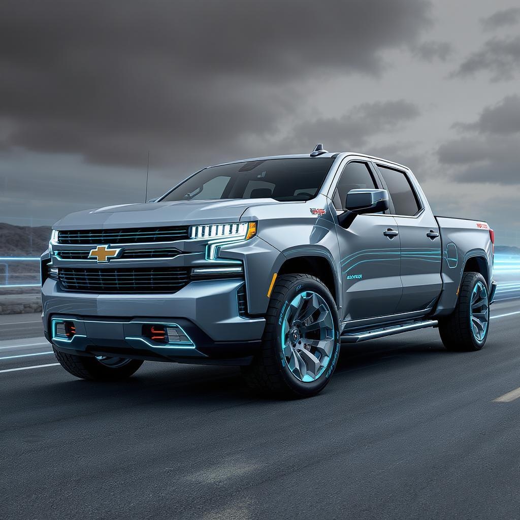 Wide-Angle Perspective, innovative hidden headlights, aerodynamic front design, five-window configuration, Silverado-inspired, Chevrolet-branded, futuristic pickup truck, Cyberpunk 2077 aesthetic, concept vehicle, flawless tire design, future-centric vision.