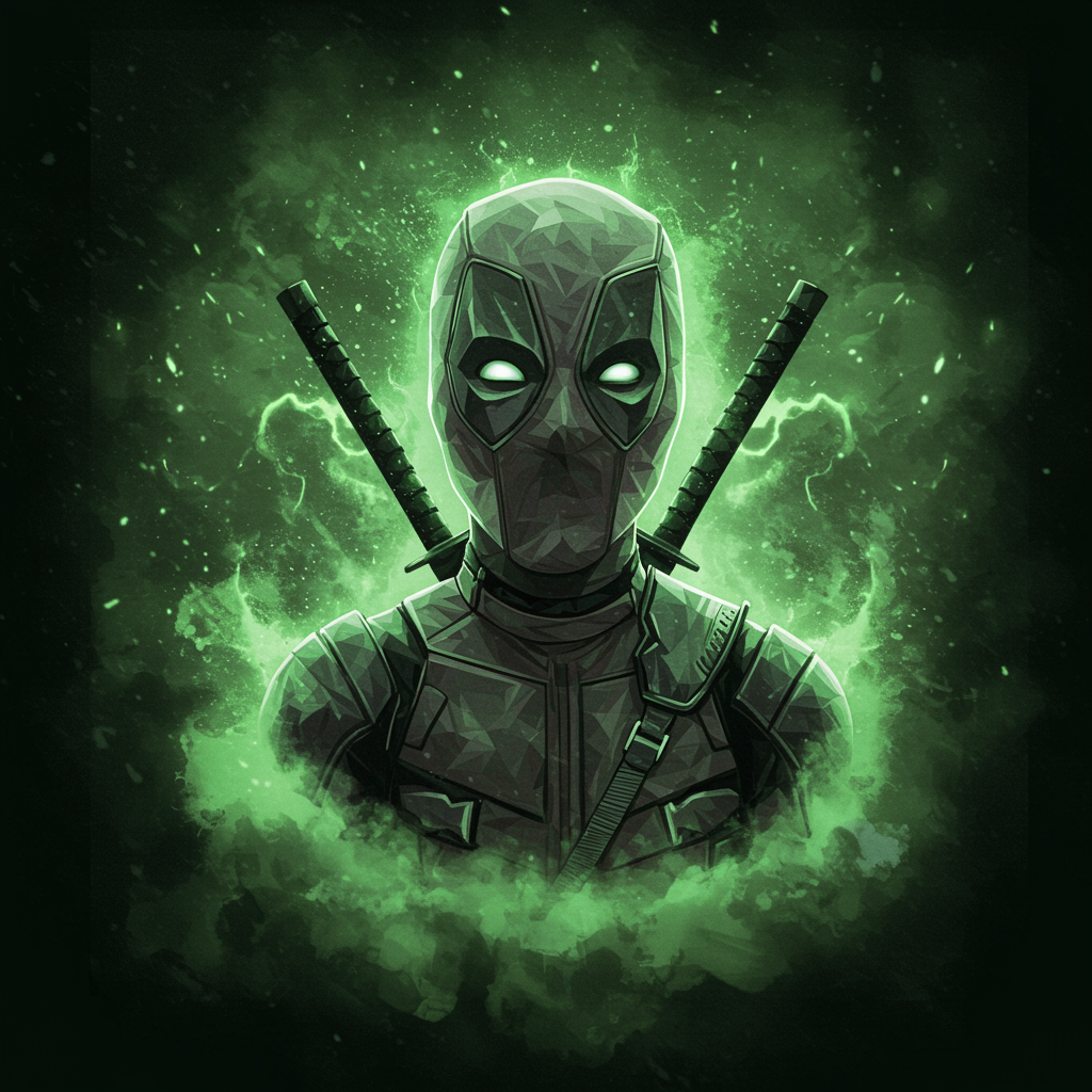View this AI-generated image featuring wizard deadpool infused with psychic energy enveloped in a swirling dark mist depicted as a caricature in the style of craig mccracken with glimmering polygonal facets hyper realistic rendered in a vibrant green monochrome palette. Created using advanced AI tec