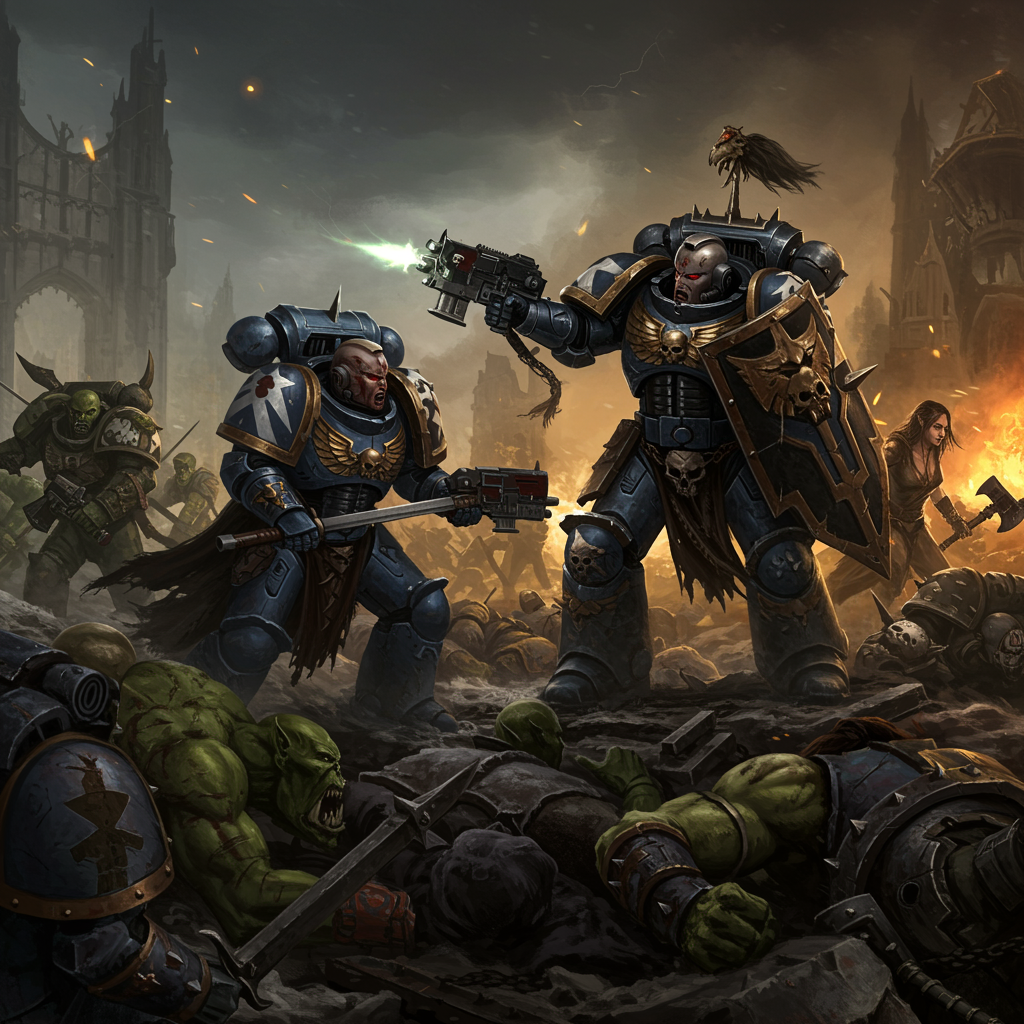 A Space Wolves Space Marine fiercely battles Orcs on a sprawling battlefield, amidst an epic action scene with cinematic flair. The lighting is dramatic, highlighting the intricate details of the scene, creating a realistic masterpiece. The composition is in sharp focus with 8k UHD resolution, capturing the raw essence of the encounter in HDR. The Marine's textured skin and remarkably detailed eyes emphasize intensity, captured with the authenticity of a cinematic camera. A woman stands resiliently within the chaos, her studio-lit presence adding depth to the scene, her features captured with stunning realism, akin to the finest 16mm film.