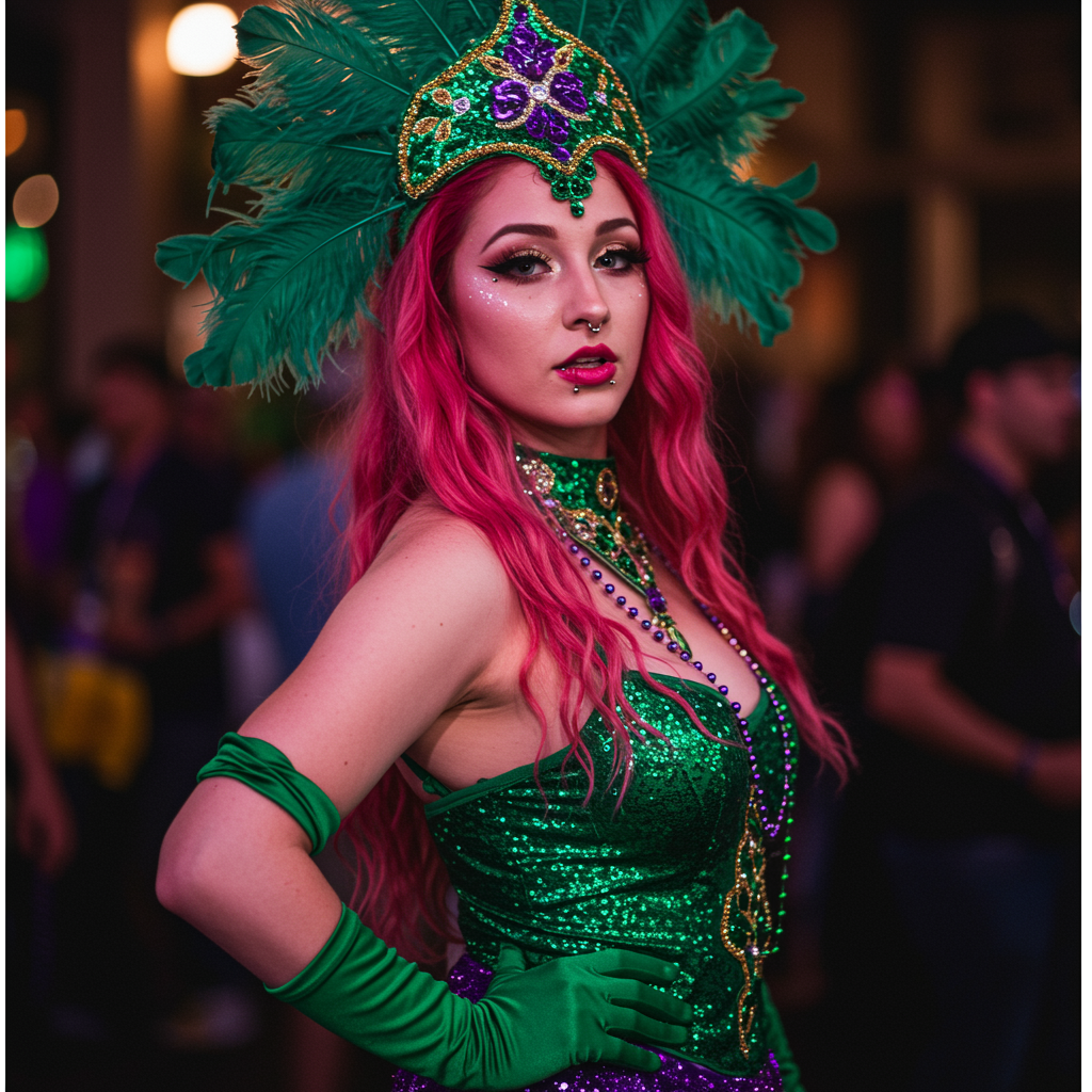 A stunning woman attending Mardi Gras, showcasing vibrant, expressive colors. She's captivating and flirtatious, making eye contact with the viewer in a captivating portrait. The image captures the realism and intricate detail of her skin, appearing photo-realistic and shot in an 8k resolution. The composition is full-length and highly detailed, with a focus on high color accuracy. She sports a piercing, and the scene is set with diffused soft lighting and a shallow depth of field, maintaining sharp focus. The atmosphere is hyperrealistic with cinematic lighting, without any distracting elements or imperfections in the visual presentation.