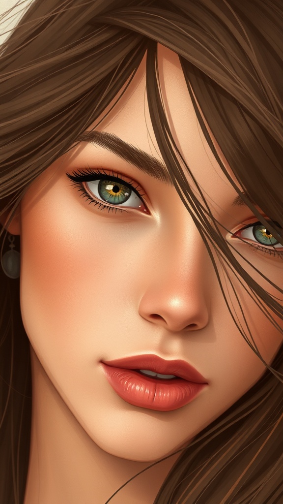 An illustration of a captivating woman with flowing brown hair, inspired by the styles of Ingrid Baars and J. Scott Campbell, rendered in warm hues of dark beige and subtle light amber. This close-up captures her enchanting gaze, echoing the charming essence of characters by Thiago Valdi. The artwork is presented in exquisite 8k resolution, offering intricate details and a mesmerizing aesthetic.