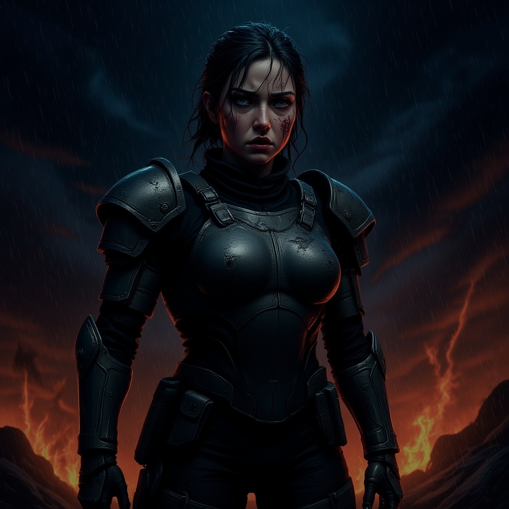 View this AI-generated image featuring a young woman clad in worn gundam armor stands amidst a fierce battlefield on a dark stormy night her armor bears signs of intense combat with battle scars and rain drenched surfaces reflecting the scattered light around she is in the midst of an epic showdown