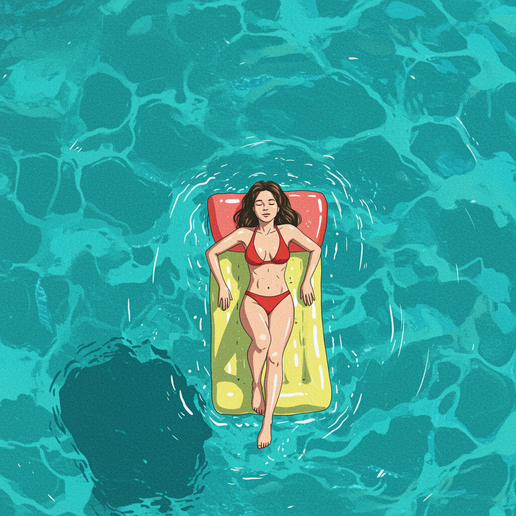View this AI-generated image featuring a young woman leisurely reclining on a vibrant pool float drifting gently in a sunlit lagoon on a warm breezy summer afternoon surrounded by the soft sounds of water lapping and distant laughter. Created using advanced AI technology, this image showcases vibran