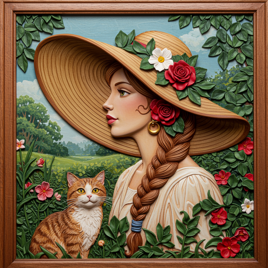 View this AI-generated image featuring a stunning 3d wooden relief depicting a woman in profile her face gracefully adorned with a wide brimmed hat embellished with intricate floral accents exuding elegance and artistry she sits peacefully in a lush garden her faithful cat by her side her long hair