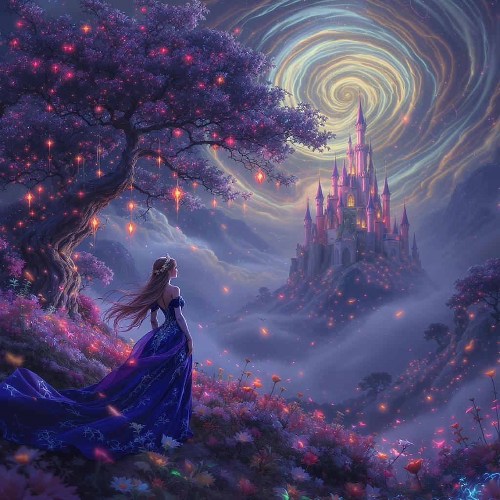 In a fantastical world where dreams are realized, a surreal and vivid image emerges from the depths of a beautiful imagination. The scene is intricately detailed, an 8k masterpiece filled with a colorful yet dark mist that whispers the secrets of life. Dynamic lights dance across the landscape, reminiscent of the works of Jesper Ejsing. In the foreground, a mesmerizing fantasy princess gazes wistfully over an enchanting landscape. Her eyes are drawn to an ethereal castle that stands majestically on a distant hill. It's an exquisite vision, breathtaking in its splendor and mystery.