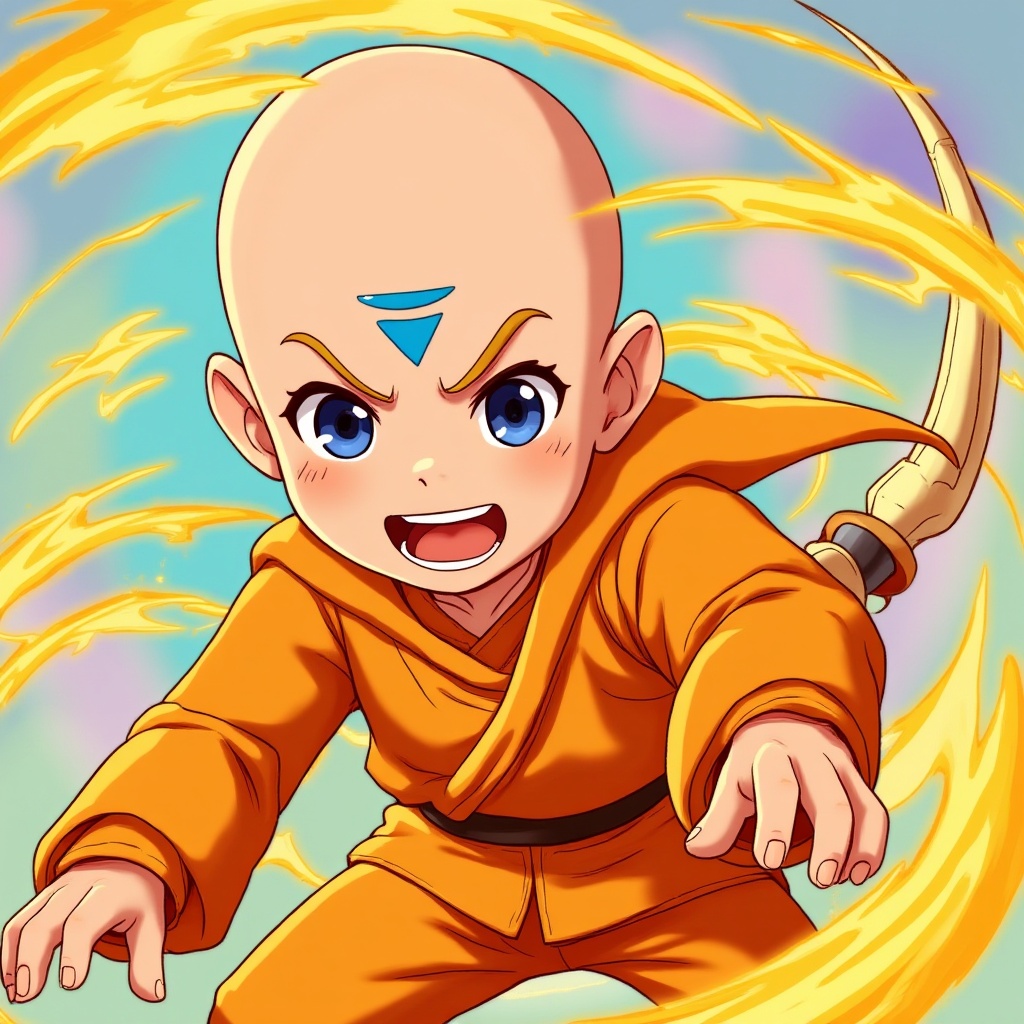 Young Avatar Aang from The Last Airbender, depicted in a vibrant and imaginative style similar to Furaffinity, wearing flowing orange robes. Aang is characterized by a light-hearted and adventurous expression, surrounded by dynamic elements that capture the essence of airbending. His eyes are bright with curiosity and excitement, and his bald head features the iconic blue arrow tattoo. The background is a subtle blend of colors that harmonize with Aang's vibrant attire, creating a lively and mystical atmosphere. Aang is poised as if he's in the middle of an airbending move, with swirling gusts of air adding motion and energy to the scene, seamlessly blending a sense of fantasy with youthful exuberance.