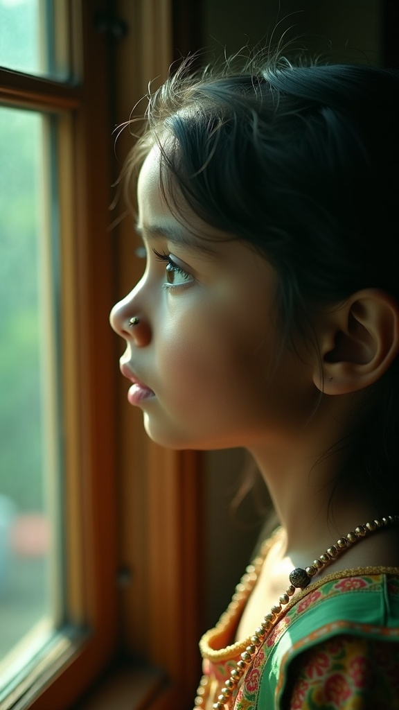View this AI-generated image featuring a curious young indian girl gazes thoughtfully out the window her striking distinctive nose capturing the soft light reminiscent of manipulated photography styles the scene reflects an artistic touch as if discovered in a vibrant flickr collection with mirrored