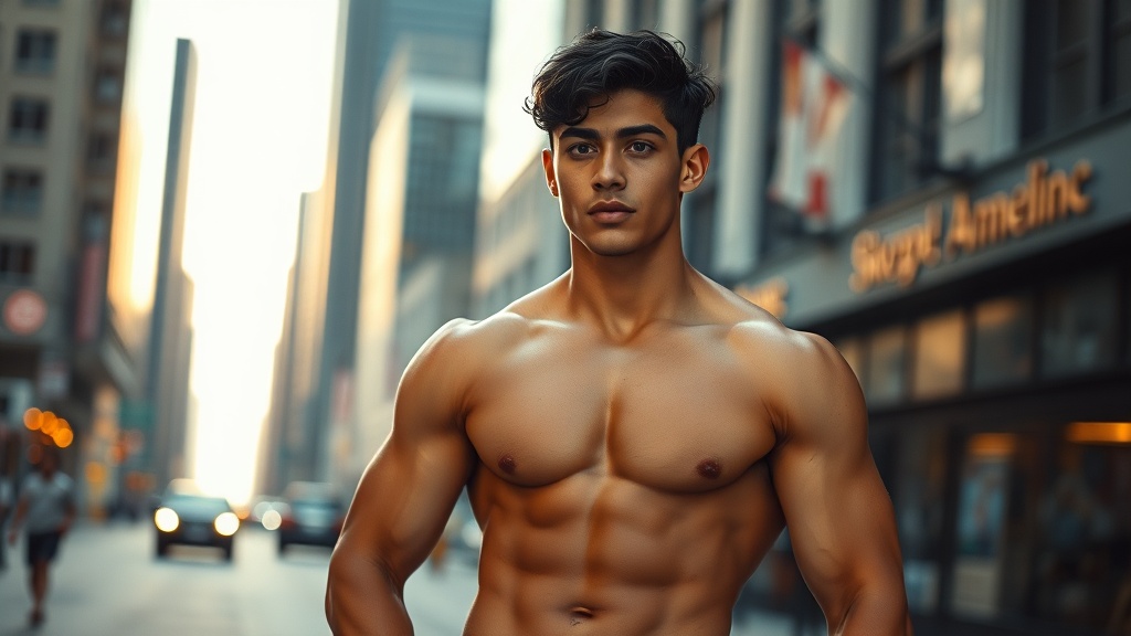 View this AI-generated image featuring a striking young man in the bustling city during late afternoon standing with confidence and poise his features exuding an undeniable allure his physique is athletic and sculpted showcasing his mexican american latino heritage clad in stylish form fitting short