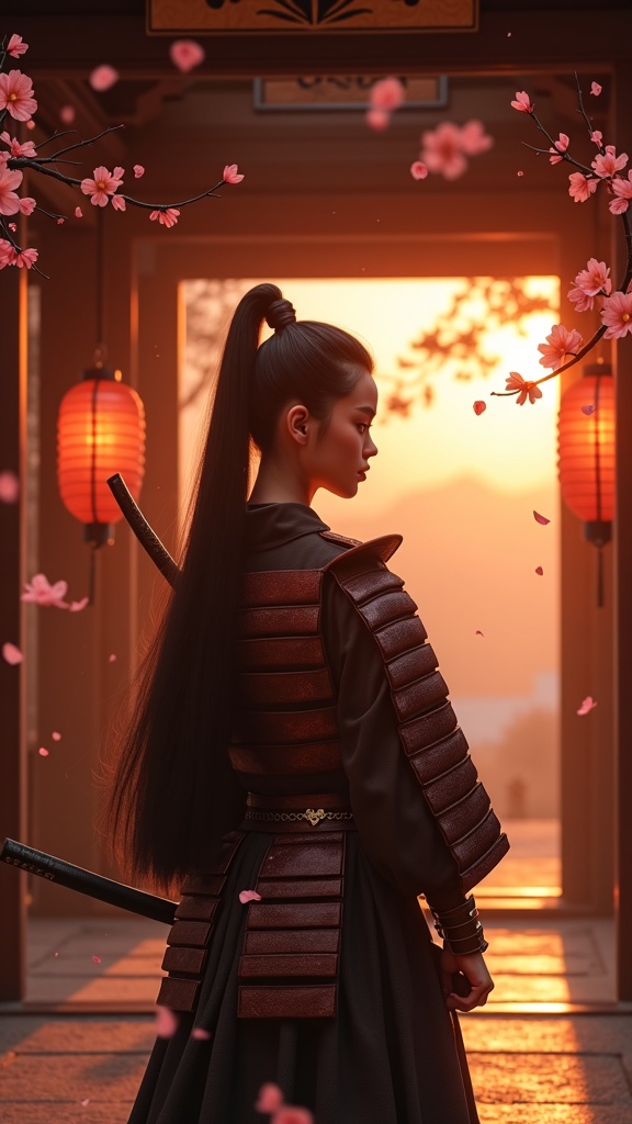 Young Samurai with long flowing black hair tied in a ponytail, adorned in intricate samurai armor, poised elegantly within a traditional Japanese temple. Cherry blossom petals drift gently through the air, while ornate lanterns cast a warm glow. The scene is bathed in the gentle embrace of a glowing sunrise, creating a serene and ethereal ambiance. Delicate shadows play across the temple's wooden structures, enhanced by dramatic and tranquil lighting. Captured in exquisite detail, this high-definition RAW color photograph is rendered in ultra-high resolution, showcasing hyper-realistic textures and lifelike depth. With rich chromatic contrasts and vivid realism, the scene is reminiscent of a professional 8K CG wallpaper, captured through a physics-based rendering approach with a f1.6 lens and inspired by the cinestill 800 aesthetic.