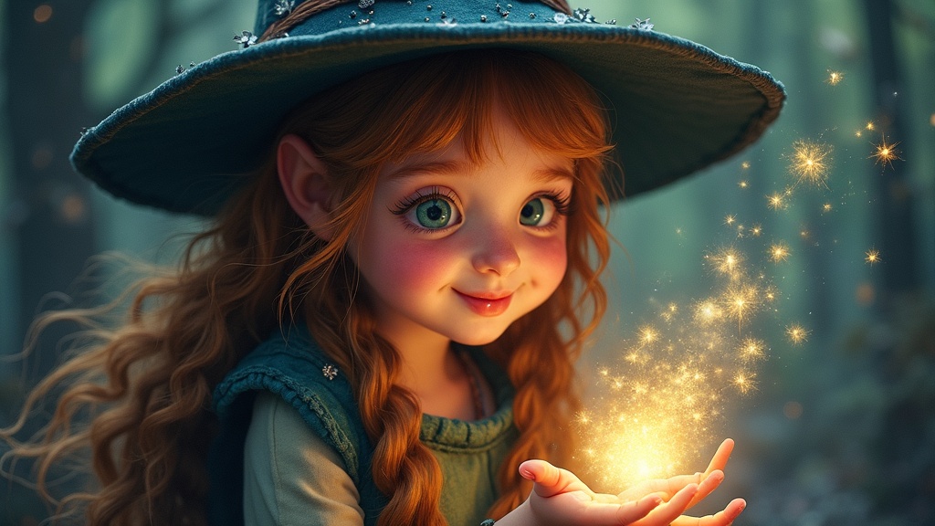 A delightful young witch casting a mesmerizing spell, with a charming face and an expression of awe and wonder. The scene captures the enchantment and magic in a colorful, whimsical style, reminiscent of a magical world filled with wonder and surprise. The composition focuses on her expressive features and the lively energy radiating from the spell. The atmosphere is playful and enchanting, bringing to life the spirited imagination of a young witch exploring her magical abilities, all depicted with a touch of innocence and curiosity.