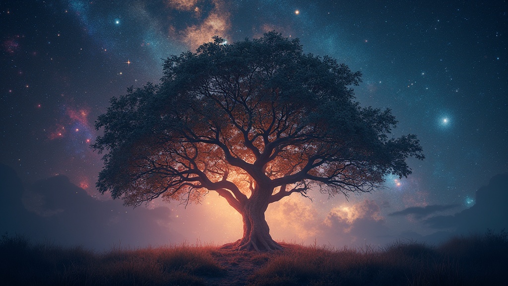 View this AI-generated image featuring a cosmic genesis unfolds as a majestic leafy tree emerges its branches intertwining with vibrant streams of colorful light against a vast epic galactic sky the scene is professionally graded with soft shadows and minimal contrast capturing the moment in clean s