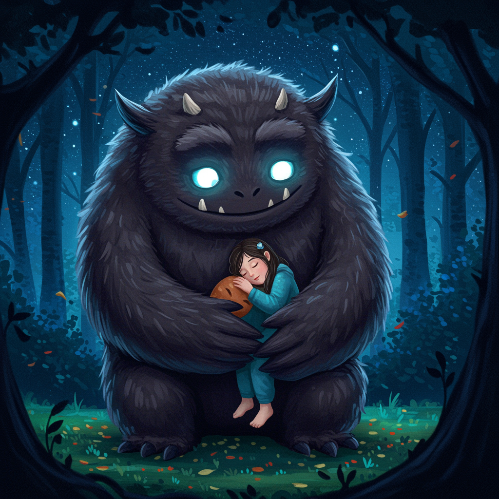 A towering, gentle monster with gleaming eyes cradling a little girl in its massive arms against a moonlit forest backdrop, its protective stance contrasting with the softness of her peaceful slumber amidst the rustling leaves and distant stars.