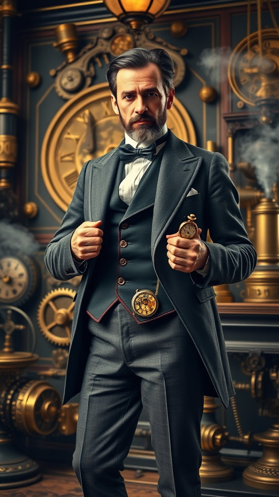 Gentleman adventurer Phileas Fogg stands poised in an opulent Victorian study filled with intricate brass gears and steam-powered contraptions, his tailored waistcoat adorned with elegant clockwork details, a gleaming monocle over one eye, and a finely crafted pocket watch in hand, exuding an air of meticulous precision and daring as steam softly billows in the background and the faint hum of machinery underscores his audacious spirit of exploration.