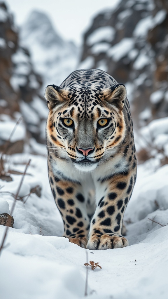 A National Geographic-inspired award-winning wildlife photograph captures a snow leopard prowling through a wintry rocky mountain woodland on an overcast day, its surroundings blanketed in snow. The image offers a full-body perspective of the majestic creature, rich with intricate detail and captured in high resolution. The snow leopard locks eyes with the viewer, its gaze piercing and intense, conveying a sense of predatory focus. The photo boasts hyper-detailed eyes, with the entire scene in crisp focus and enhanced by natural lighting that highlights the leopard's luxurious fur and the serene beauty of its snowy habitat.
