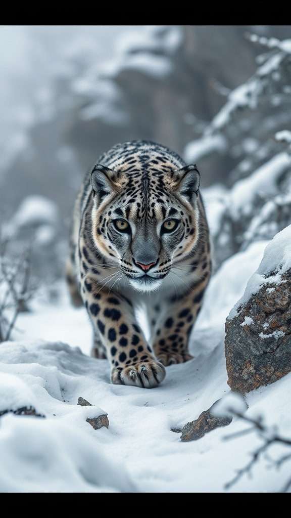 A National Geographic-inspired wildlife photograph capturing a snow leopard stealthily prowling through a snow-covered, rocky mountain forest on a misty day, the full body magnificently detailed. Its piercing eyes lock onto the viewer, radiating an intense predatory gaze. Every feature, from its hyper-detailed eyes to its finely textured fur, is in crisp focus under the diffused natural lighting, highlighting the majestic beauty of this elusive creature amidst the tranquil winter landscape, in a high resolution, panoramic 9:2 aspect ratio.