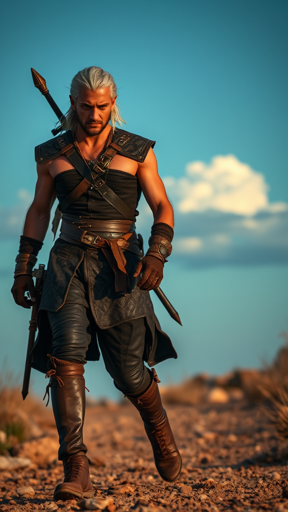 Geralt of Rivia in an assertive stance with a piercing gaze, wearing intricately detailed black leather pants and rugged work boots, his skin appearing toned, tanned, and weathered with dust and dirt. Captured with a DSLR for a cinematic effect against an azure sky. As he strides forward, the air is thick with heat, and the setting is medieval with muted hues and soft, cinematic lighting. The image is a masterpiece of hyper-detail, shot in 8k for optimal clarity, with carefully captured film grain. The composition ensures sharp focus and high quality, with Geralt's head centered in the frame, enveloped in an epic wide shot that accentuates the grandeur of the scene.
