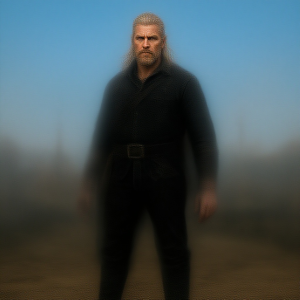 Geralt of Rivia in an assertive stance with a stern gaze, clad in highly detailed black leather jeans and rugged work boots. His skin is toned, tanned, and marked with dust, conveying a sense of hard-earned experience. Captured with a DSLR, the detailed face is framed in a wide shot, set against an azure sky, embodying a medieval atmosphere. The scene is bathed in soft, muted cinematic light, rich with intricate, hyper-realistic details. Masterfully composed in 8k resolution with HDR quality, the image boasts sharp focus and film grain texture, ideal as a high-quality wallpaper. The background showcases a subtly blurred, atmospheric medieval setting, enhancing the overall epic feel of the composition.