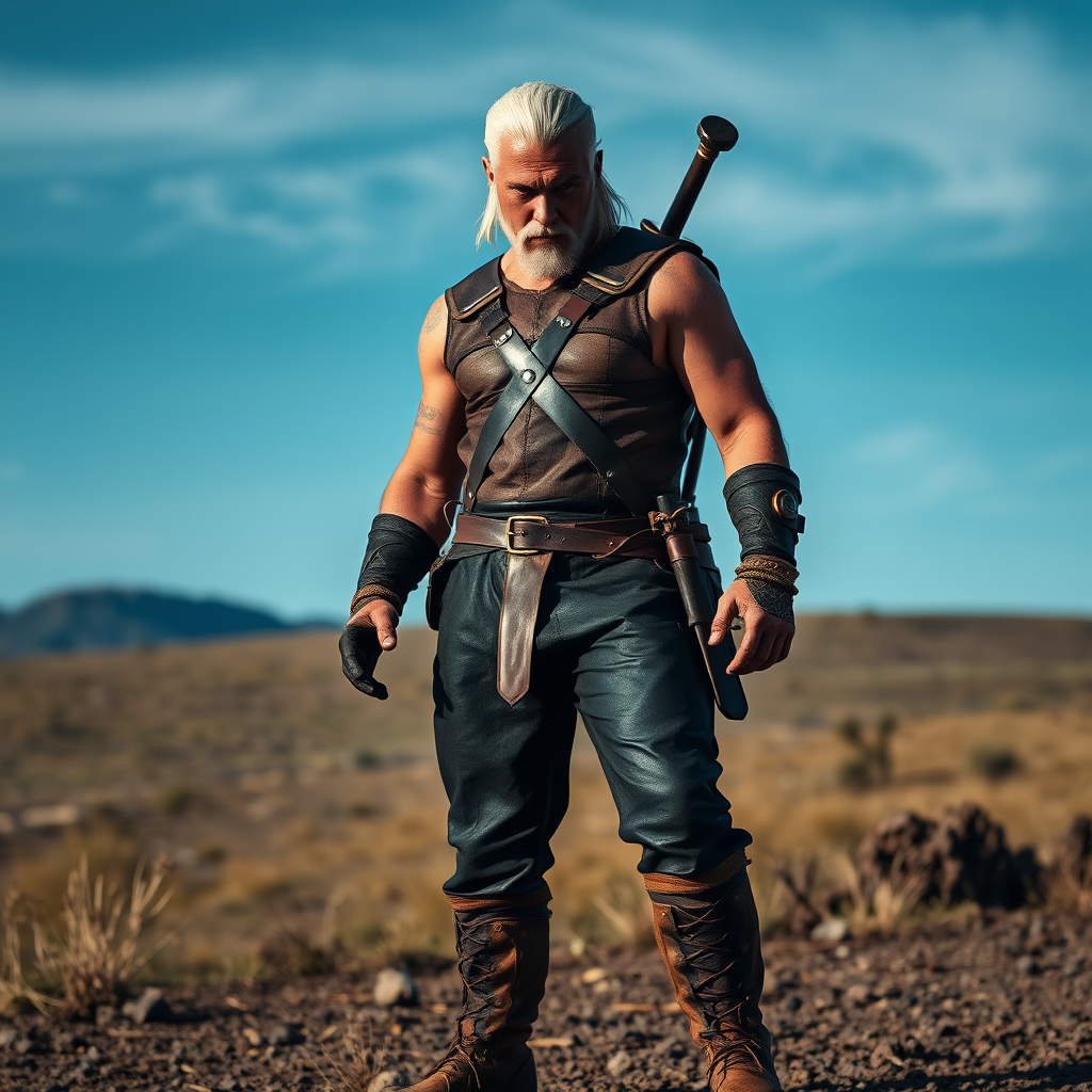 Geralt of Rivia standing fiercely, his intense eyes locked in a determined stare, wearing intricately detailed black leather pants paired with sturdy work boots. His skin appears sun-kissed, showing signs of grit and dust, captured in high-definition with a DSLR camera, showcasing his chiseled features. Set in a medieval landscape under a vibrant azure sky, the scene exudes a sense of rugged strength. The lighting is soft and cinematic, highlighting the muted color palette and intricate details, rendering an 8k UHD masterpiece with subtle film grain for an authentic look. The composition is flawless with a sharp focus on Geralt’s head and body, ensuring anatomical accuracy and artistic integrity, preserving the integrity of the lore while infusing a touch of creativity into the scene.