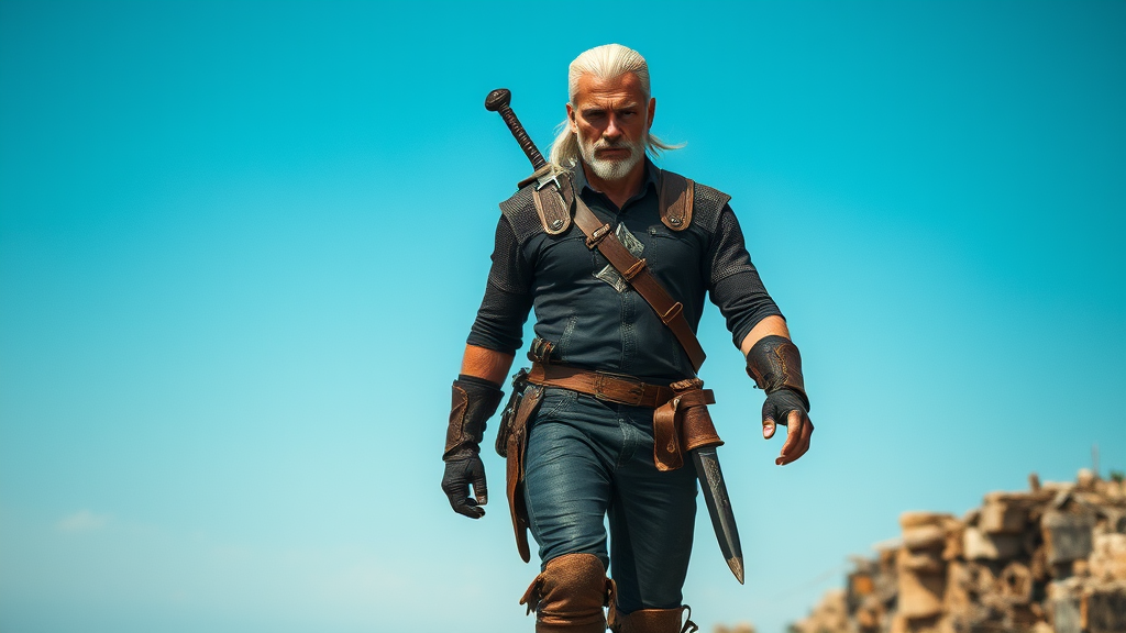 Geralt of Rivia striking an assertive stance with a piercing gaze, wearing intricately detailed black leather jeans, complemented by sturdy work boots. His physique is defined and sun-kissed, with hints of dust and dirt adding rugged character. Captured with a DSLR, his face is sharply defined, exuding a cinematic aura with medieval undertones. Under a vivid azure sky, he's depicted walking purposefully, surrounded by muted hues and softened cinematic light. The image is rich in detail, achieving a hyperrealistic masterpiece quality in 8k, making it perfect for wallpaper use. The sharp focus maintained in the wide shot ensures both clarity and depth, with a subtle film grain enhancing the visual texture.